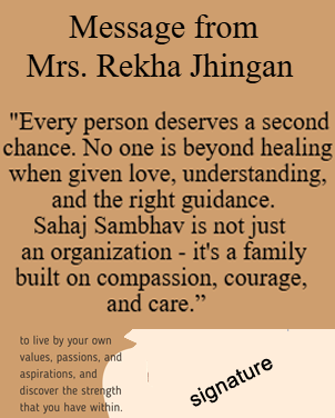 Founded in 2006, SAHAJ SAMBHAV is a non-profit, non-government organisation (NGO) since 2006. It is being run under the guidance of Mrs. Rekha Jhingan, Director having an experience of more than 2 decade in this field. The prime objective of our organisation is to serve the society in order to have a pleasant and peaceful environment. We are working in different disciplines/field like Drug and Alcohol de-addiction/rehabilitation , women Empowerment, Child labour/ welfare, HIV/AIDS awareness, Family Counselling Centre.
